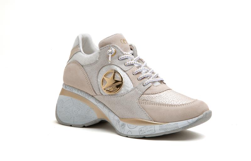 / Esportiu amb taló rodó color beig i or amb els cordons elàstics